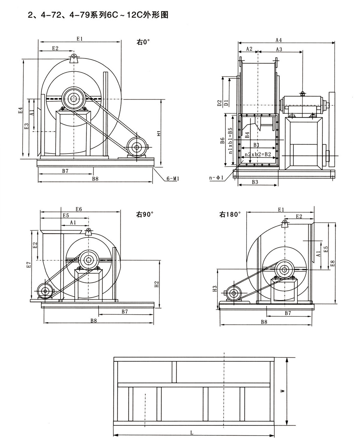 2、型式:4-72型離心通風(fēng)機可制成右旋和左旋兩種型式,風(fēng)機的傳動(dòng)方式為A、B、C、D四種,6#以下采用A式,7~12#采用C、D式,16#以上采用B式。